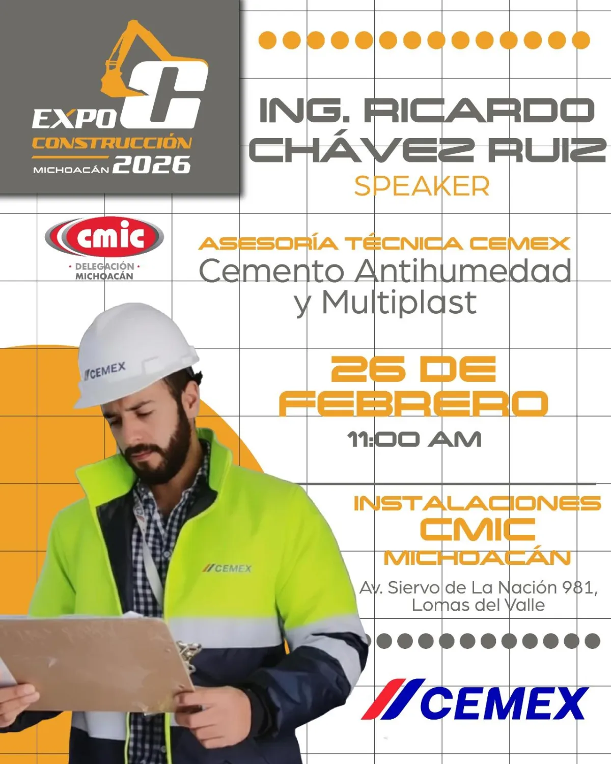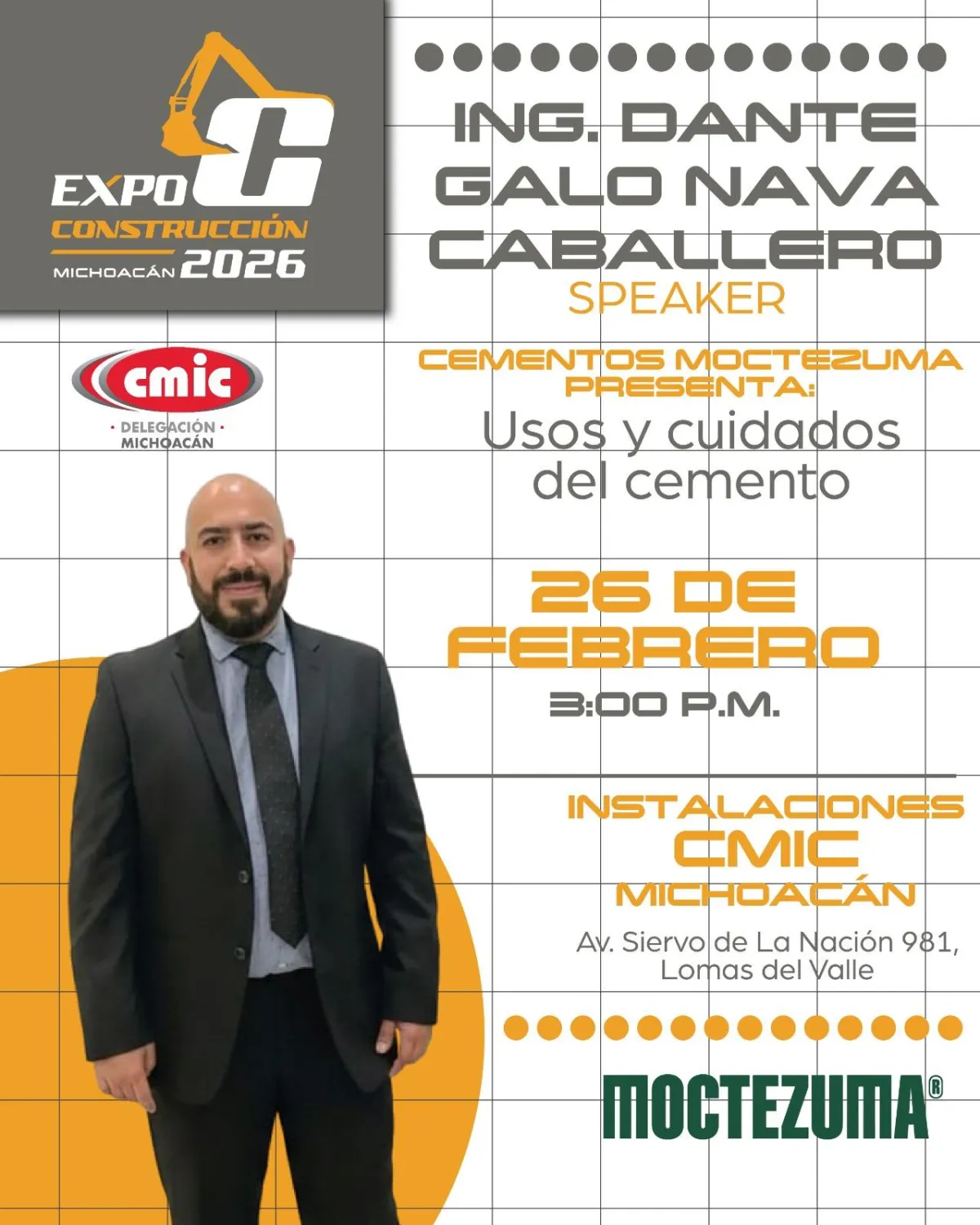 El Ing. Dante Galo Nava Caballero de Cementos Moctezuma compartirá conocimientos esenciales sobre el uso correcto y cuidados del cemento en obra. Una conferencia práctica enfocada en optimizar resultados y garantizar la calidad en tus proyectos de construcción.